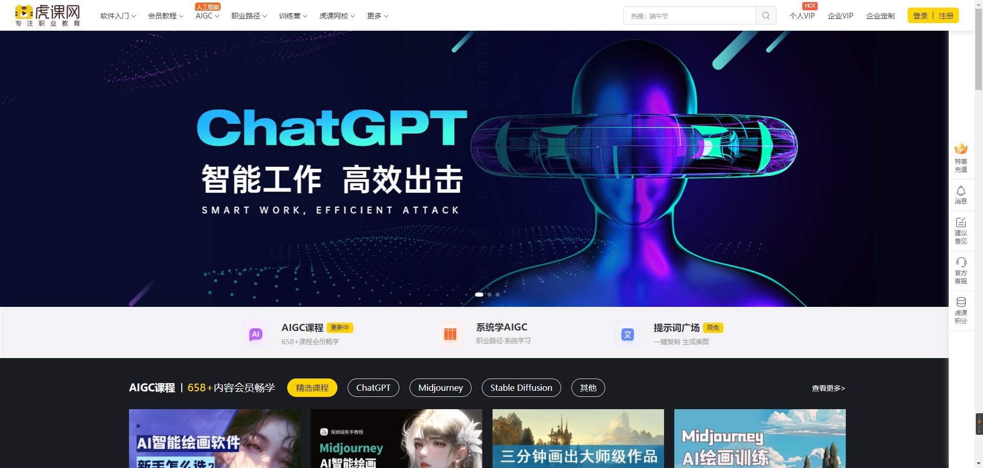 虎课网专门开发了AIGC有关的使用培训教程,包括ChatGPT进阶教程、AI绘画教程(例如Midjourney、Stable Diffusion)、电商设计等多种AI设计培训课,旨在帮助用户快速入门AIGC技术,并在实际工作中应用。 并且开设Prompt广场,可以看到优秀的AI作品,点开后还能一键复制关键词,有比较活跃的AIGC社区氛围。