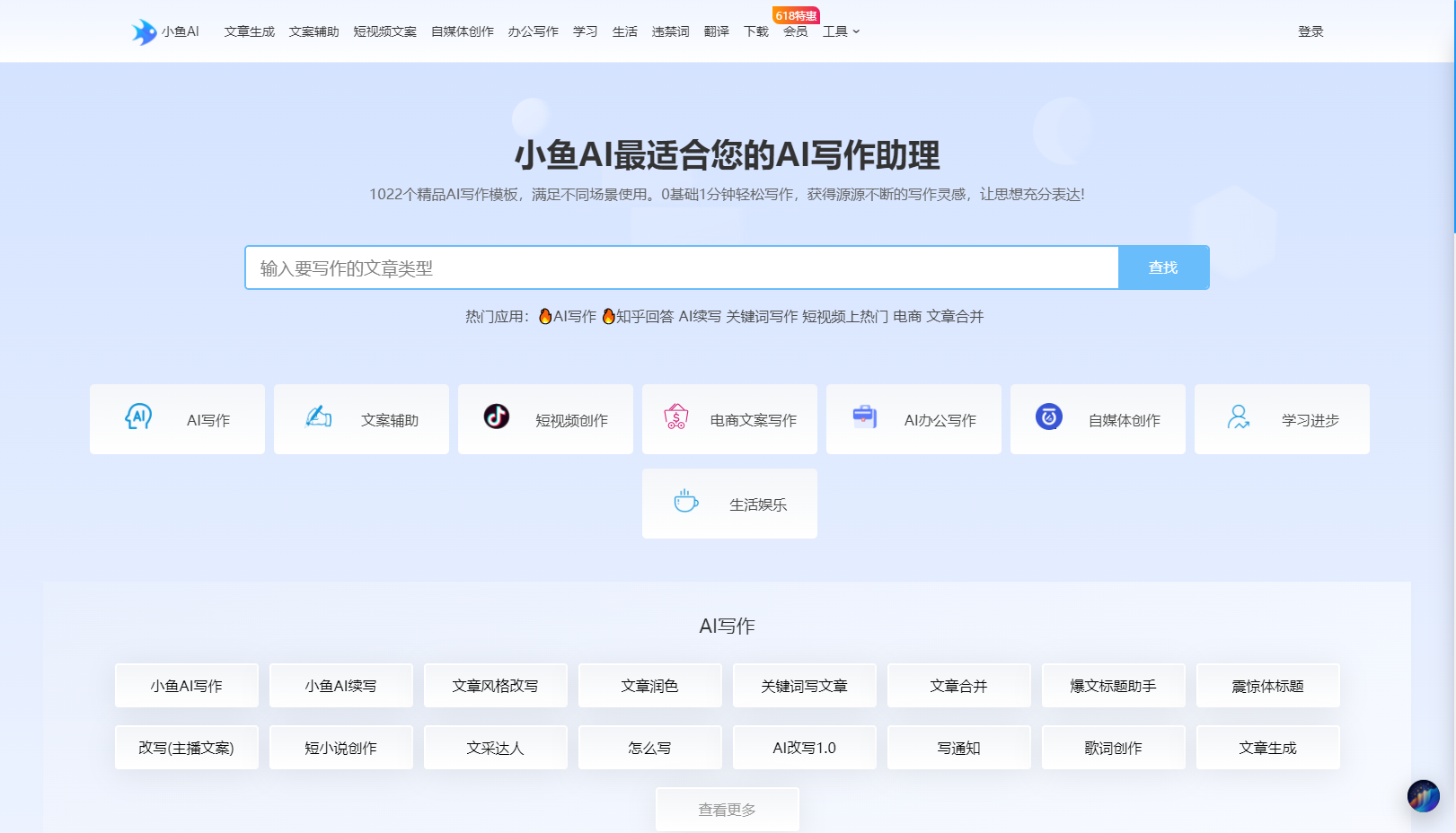 小鱼AI写作一款在线智能AI写作平台,内置AI写作模板,满足不同场景使用