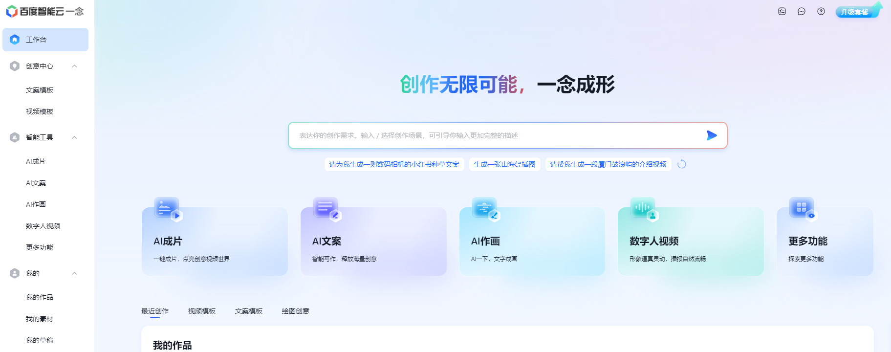 百度智能云一念是基于百度文心大模型打造的内容创作平台。集文、图、视频等多种内容模态于一体,旨在助力企业更便捷高效地获取内容创作灵感和营销物料。
