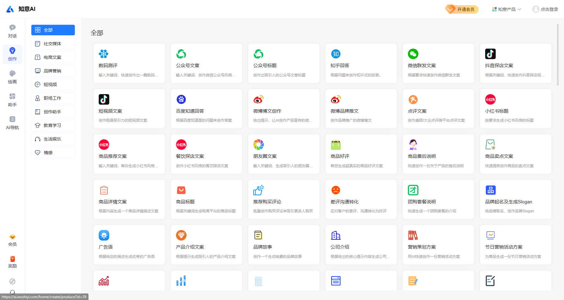 (2)AI创作:除了智能对话功能,知意AI还提供多种创作模板,生成各种类型的文本内容,如品牌营销、电商文案、职场工作、教育学习等,完美契合创作场景需求,方便用户快速处理日常所需的特定场景内容创作需求。