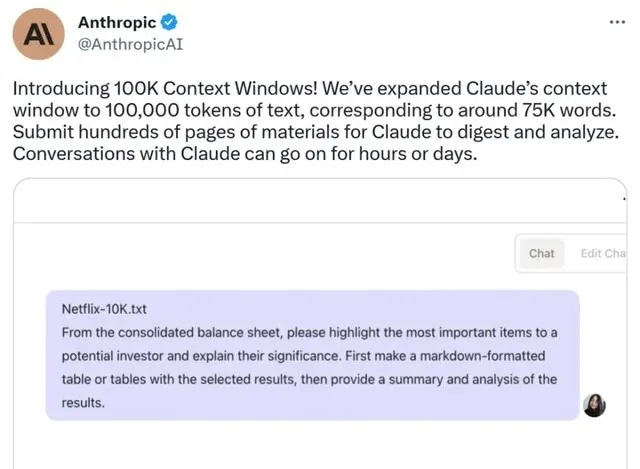 时隔没多久,本周四,Anthropic 推出了 100K Context Windows,它将 Claude 的上下文窗口从 9k token 扩展到了 100k,这相当于 75,000 个单词。这意味着企业可以提交数百页材料让 Claude 消化和解释,并且与它的对话可以持续数小时甚至数天。现在可以通过 Anthropic API 访问 100K context windows。